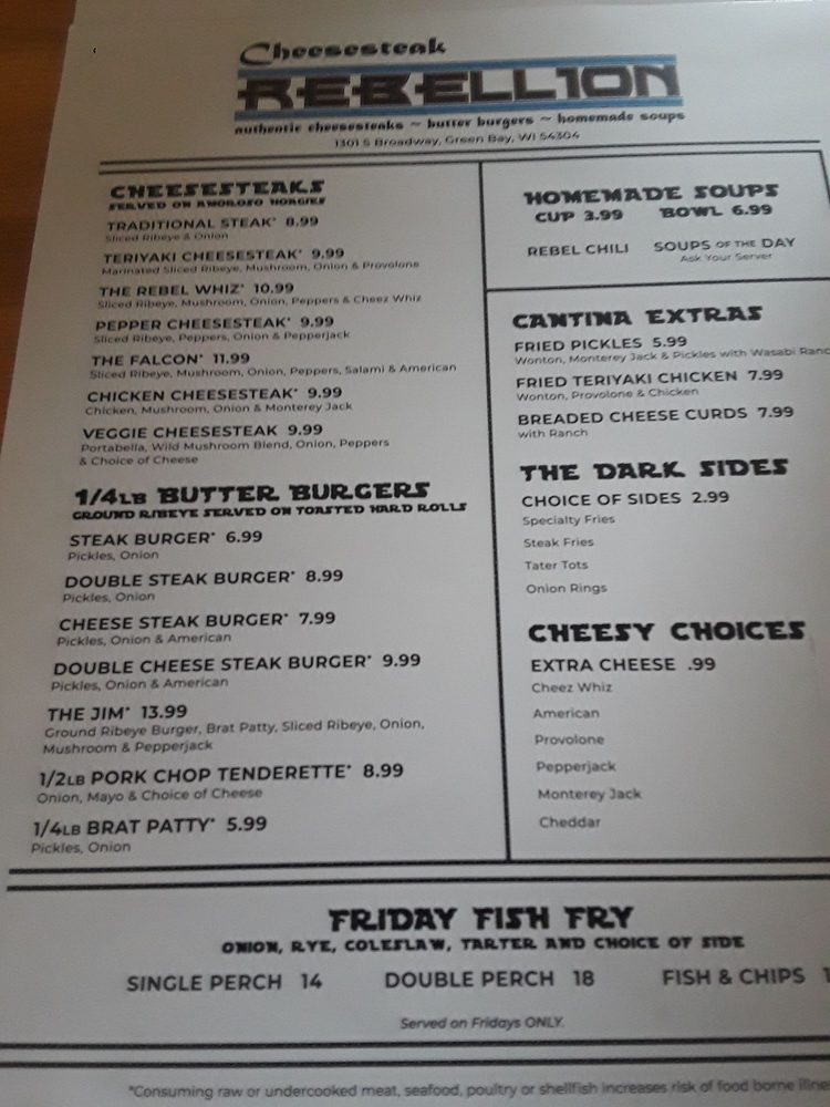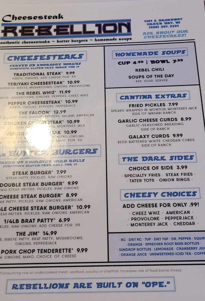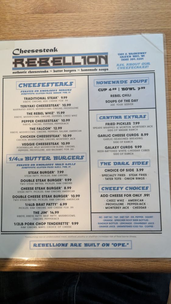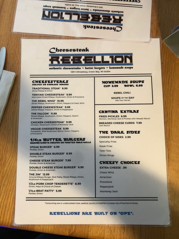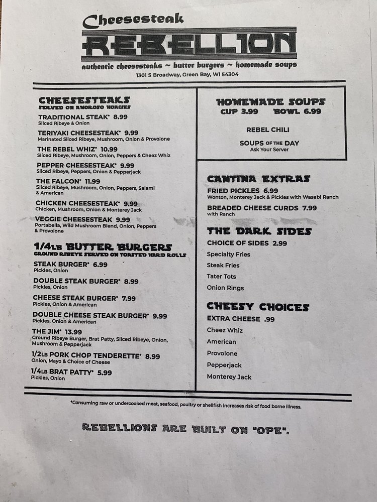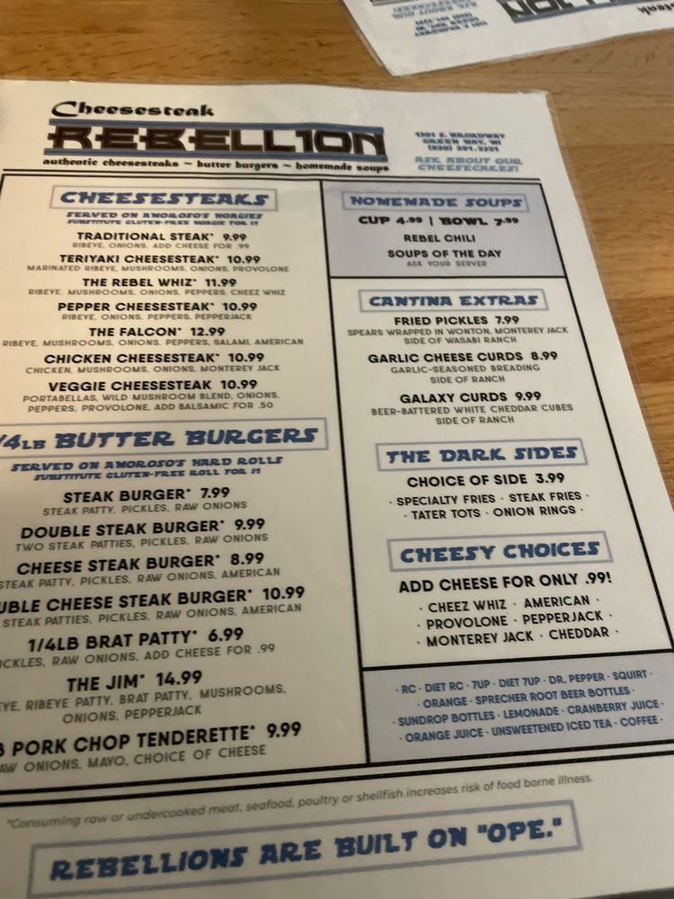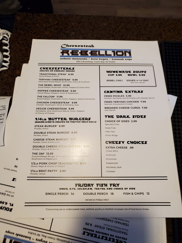 Cheesesteak Rebellion is a rebellious gem in Green Bay, WI, offering a unique dining experience blending Cheesesteaks, Burgers, and Soups. Their signature dishes include Traditional Steak and Teriyaki Cheesesteaks, as well as flavorful Butter Burgers. The eclectic Star Wars-themed atmosphere adds character and charm to the dining experience. Customers rave about the Rebel Whiz Cheesesteak and the flavorful Cheese Curds. The attentive staff, friendly service, and piping hot dishes make dining here a delight. With limited vegetarian options and no high chairs available, Cheesesteak Rebellion caters to meat lovers and Star Wars enthusiasts alike. Don't miss out on this hipster, casual spot with moderate noise levels, perfect for groups and happy hour gatherings. Visit Cheesesteak Rebellion for a memorable dining experience where great food meets fun ambiance!